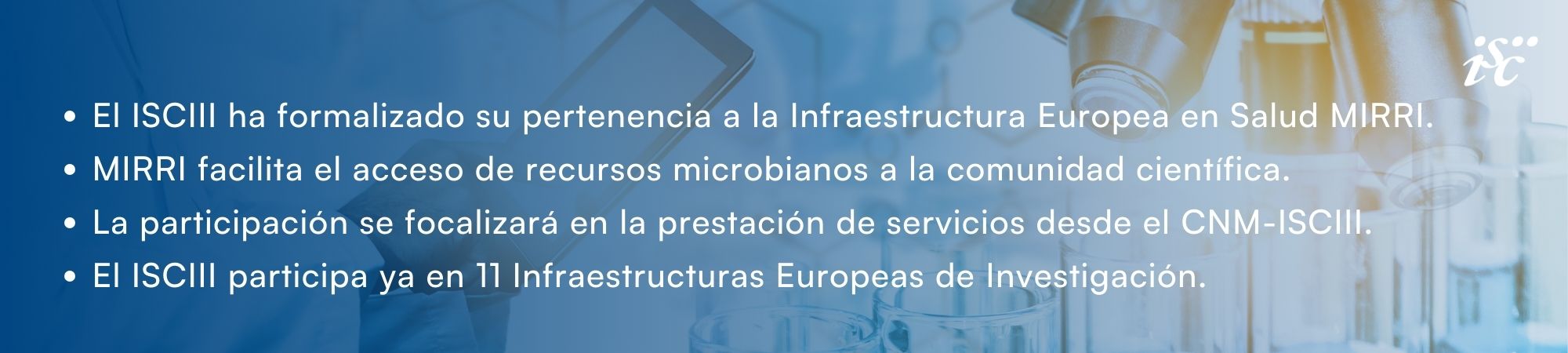Las RI son iniciativas europeas, constituidas por los Estados miembros, que trabajan en red ofreciendo recursos y servicios de máxima calidad a la comunidad científica nacional e internacional, y que promueven una investigación de excelencia. En concreto, la Infraestructura MIRRI está orientada a facilitar el acceso y la gestión de recursos microbianos para el desarrollo eficiente de la I+D+i en el campo de la biotecnología y las ciencias de la vida. MIRRI está contemplada en la Hoja de Ruta de Infraestructuras de Investigación del Foro Estratégico Europeo para las Infraestructuras de Investigación (ESFRI, en sus siglas en inglés) desde 2018.