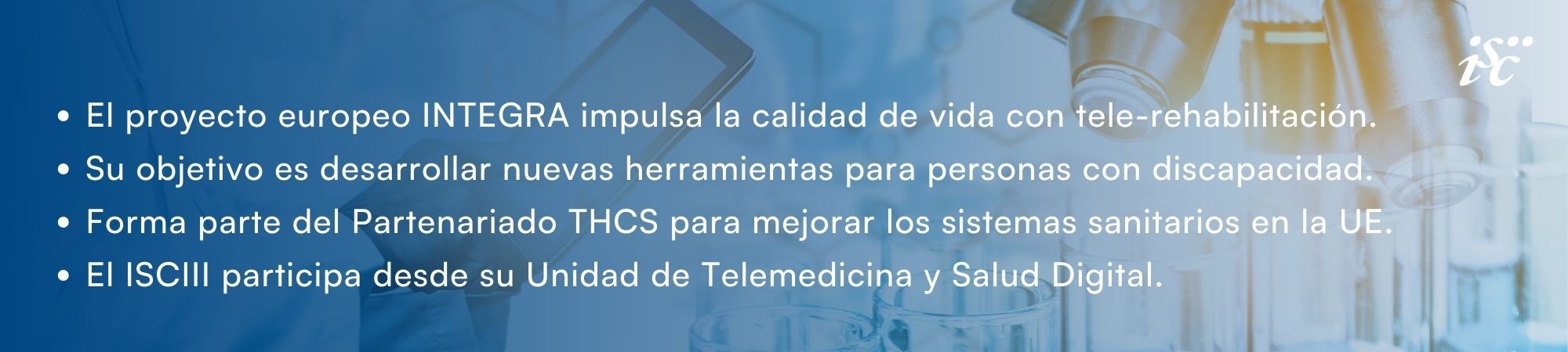 El Instituto de Salud Carlos III (ISCIII) va a desarrollar un proyecto de investigación en el marco del Partenariado europeo THCS, que se centra en la transformación de sistemas sanitarios para hacerlos más eficientes, sostenibles y centrados en las personas. El proyecto, que se denomina INTEGRA y que se desarrollará desde la Unidad de Telemedicina y Salud Digital (UITeS) del ISCIII, está enfocado en el desarrollo de herramientas de tele-rehabilitación para facilitar la calidad de vida de personas dependientes y con discapacidad. La doctora Victoria Ramos, de la citada unidad, es la investigadora principal.