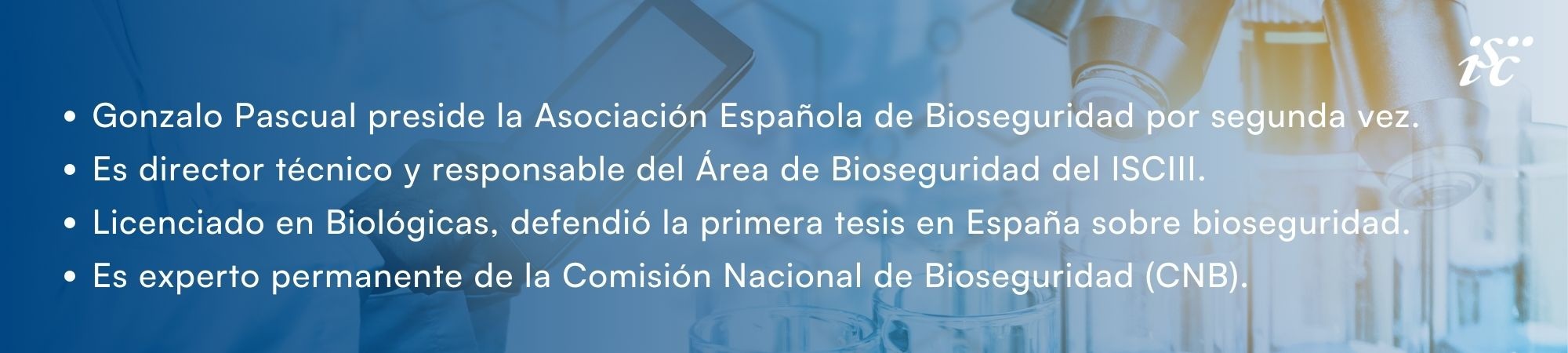El doctor Gonzalo Pascual Álvarez es licenciado en Ciencias Biológicas por la Universidad Complutense de Madrid (UCM) y titulado superior técnico especialista en Bioseguridad y Biocontención de Organismos Públicos de Investigación (OPI). Tiene un doctorado en Ciencias Veterinarias -defendió la primera tesis en España sobre bioseguridad-, además de un Máster en Microbiología y Parasitología.
