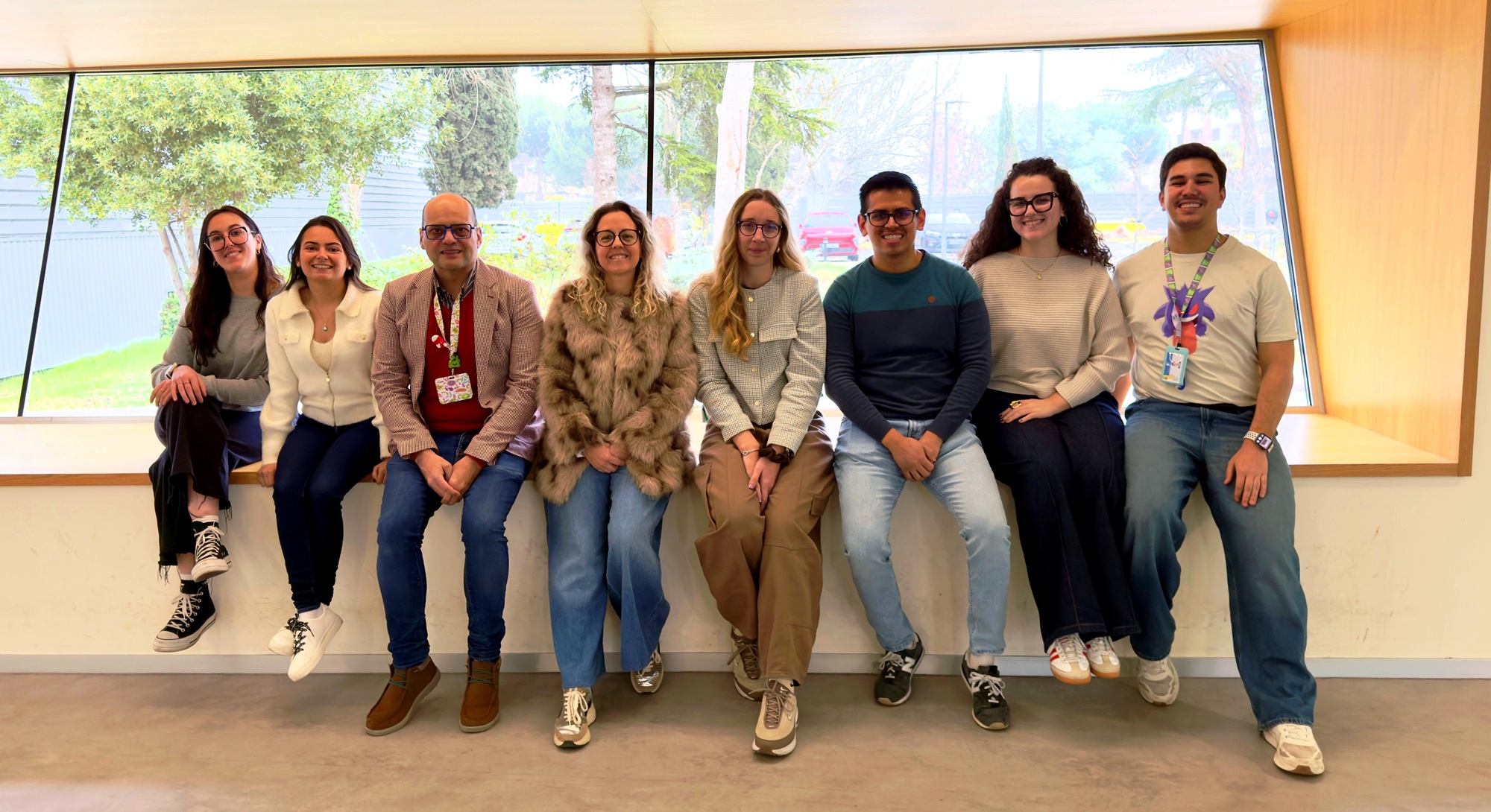 De izquierda a derecha: Aida Úbeda, Covadonga Pérez, Jose Yuste, Mirian Domenech, Mirella Llamosí, Erick J Vidal, Andrea Sánchez y Julio Sempere, en uno de los ventanales del Centro Nacional de Microbiología del ISCIII.