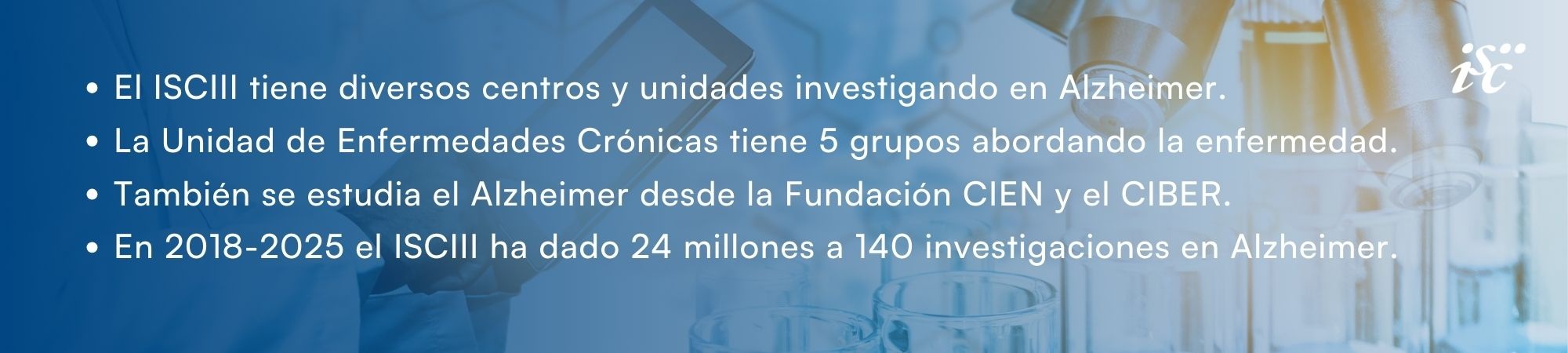 • El Centro de Investigación Biomédica en Red (CIBER) del ISCIII tiene una de sus 13 áreas científicas dedicada a las patologías neurodegenerativas (CIBERNED). Veinte grupos de investigación distribuidos en red por toda España investigan en torno a nuevos factores genéticos, biomarcadores de enfermedad y nuevas estrategias terapéuticas en la enfermedad de Alzheimer y otras demencias degenerativas. Para ello, se centran en estudios de epidemiología genética de la enfermedad, biomarcadores, modelos celulares y animales de estudio, patología molecular y mecanismos de neurodegeneración, neuroprotección y diseño de nuevas terapias. Tres ejemplos de proyectos activos en el CIBER-ISCIII sobre Alzheimer son una investigación sobre la regulación de la respuesta microglial en el desarrollo de la enfermedad, un análisis del papel de los micro-ARN circulantes como posibles biomarcadores y dianas terapéuticas de resistencia a la insulina, y un estudio sobre la implicación de la autofagia celular en la alteración de la actividad neuronal.